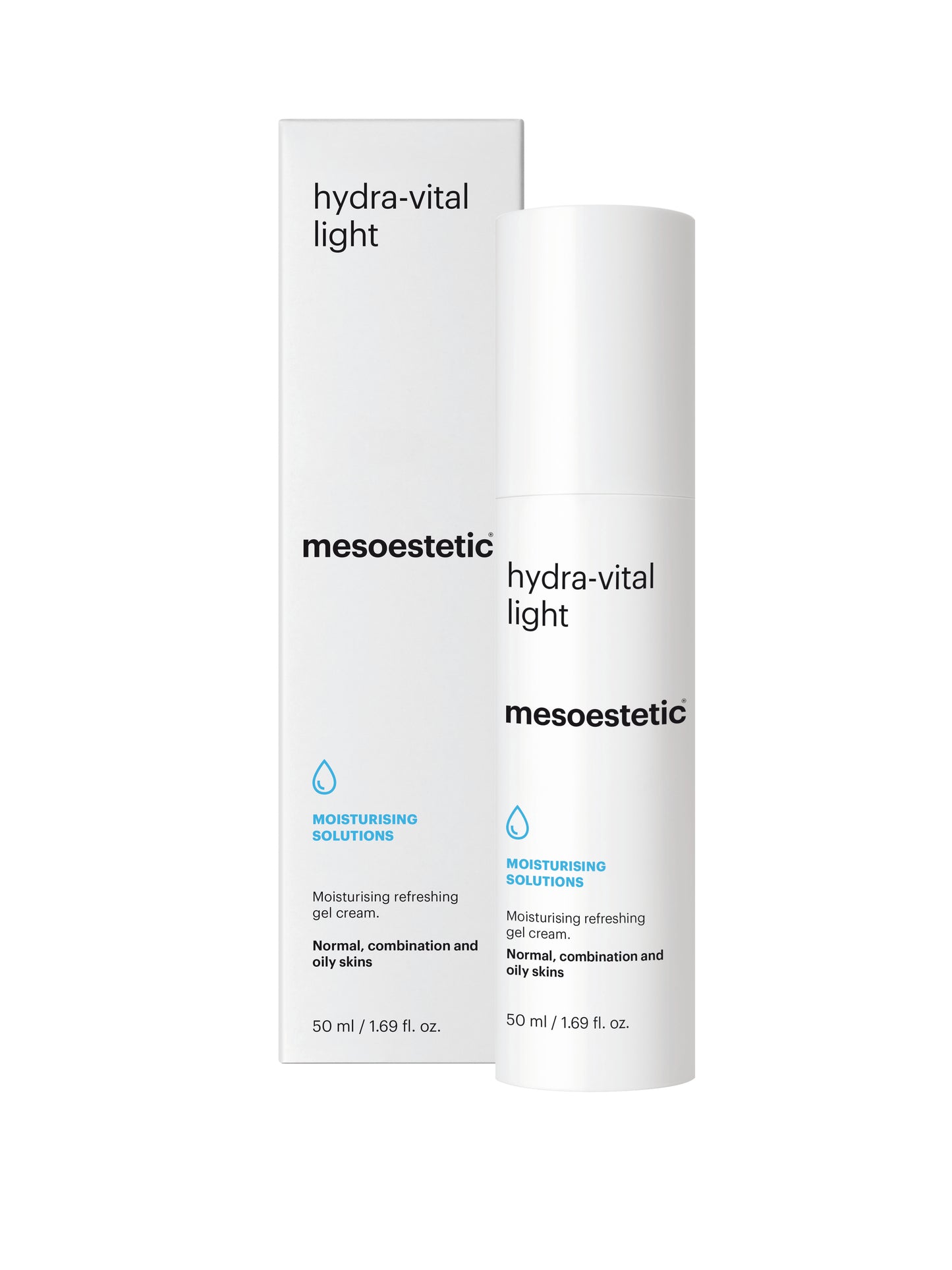 Een combinatie van diverse soorten hyaluronzuur werken in diverse huidlagen en geven een onmiddellijke hydradatie. Het biotechnologisch actief ingrediënt, Urban D-Tox, creëert enerzijds een beschermende laag die voorkomt dat verontreinigende deeltjes aan de huid hechten, en anderzijds beschermt het de huid tegen oxidatieve stress. Een plantaardige polysacharide stimuleert en versterkt de huidbarrière en voorkomt vochtverlies.Gebruik Hydra Vital Light Mesoestetic
